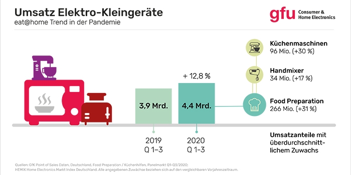 In der Folge verzeichnete das gesamte Segment der Elektro-Kleingeräte in den ersten drei Quartalen 2020 einen Zuwachs von 12,8 Prozent auf mehr als 4,4 Milliarden Euro Umsatz in Deutschland. Speziell die Haushaltsgeräte, die der Zubereitung von Lebensmitteln dienen, wuchsen in diesem Zeitraum überdurchschnittlich: Die Kategorie Food Preparation, also beispielsweise Mixer, Küchenmaschinen, Rührgeräte und Kochmixer, legte laut GfK um 31 Prozent auf knapp 266 Millionen Euro zu. Dabei wurde mit Küchenmaschinen ein Umsatz von 96 Millionen Euro (+ 30 Prozent) und mit Handmixern von 34 Millionen Euro (+ 17 Prozent) erzielt.