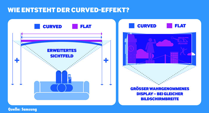 Auf Grund der Wölbung der Fernsehgeräte wird das Sichtfeld erweitert, wodurch der Bildschirm größer wahrgenommen wird als er eigentlich ist. Es entsteht ein kontrastreicher und räumlicher 3D Effekt.