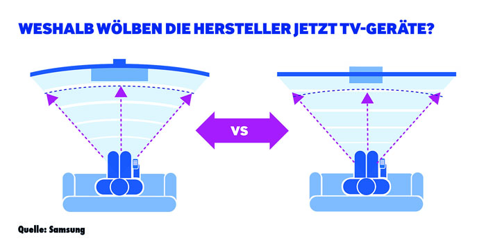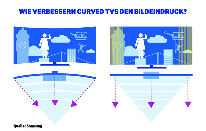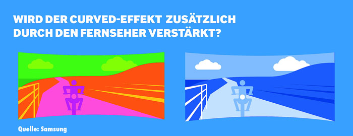 Bei Curved TVs sind alle Bildbereiche gleich weit vom Zuschauer entfernt, wenn die Zuschauer wie in den meisten Haushalten relativ zentral vor dem Fernseher sitzen. Dadurch werden Verzerrungen am Bildschirmrand minimiert.