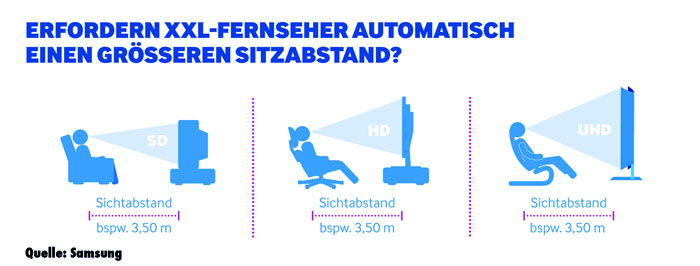 Mit UHD gelten die alten Regeln zum Sitzabstand vor dem Fernseher nicht mehr. Die Auflösung ist so detailreich, dass die Entfernung zum TV trotz größerem Bildschirm unverändert bleiben kann. Im Gegenteil: Je näher man sich am Bildschirm befindet, desto intensiver ist das Filmvergnügen. Natürlich sollte man sich auch hier nicht zu nahe vor das Gerät setzen.