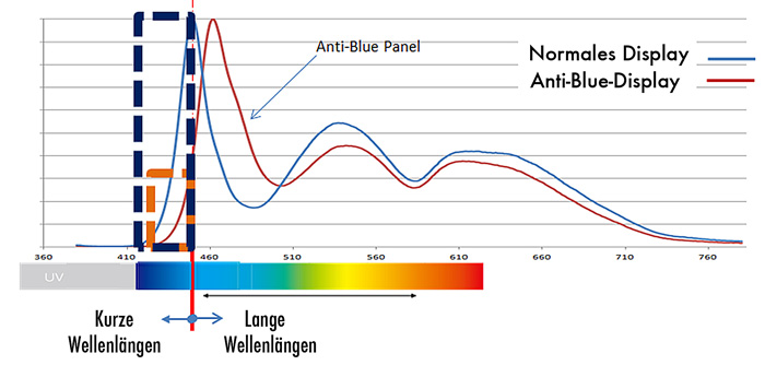 Quelle: AOC Bei der SoftBlue-Technologie wird die Wellenlänge von 450 nm auf 460 nm angehoben und über 90 Prozent der schädlichen blauen Lichtanteile eliminiert