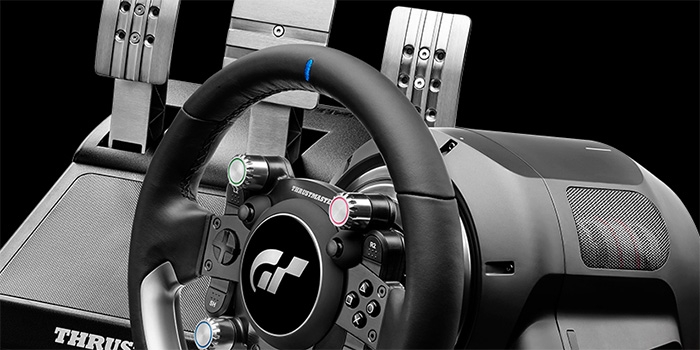 Das offizielle GT-Lenkrad ist mit echtem Leder ummantelt. Zur Ausstattung gehören zwei Mini-Joysticks und vier in Gran Turismo Sport nativ erkannten On-the-Fly-Wahlschaltern, Differenzialbremseinstellung, Traktionskontrolle, Kraftstoff-Mapping und Drehmomentmanagement ausgestattet ist.