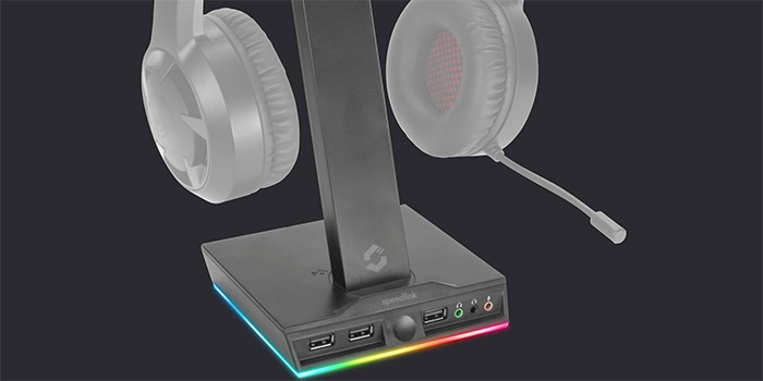 Der Speedlink EXCELLO Illuminated Headset Stand, 3-Port USB 2.0 Hub, integrated Soundcard, black ist für 29,99 Euro verfügbar.