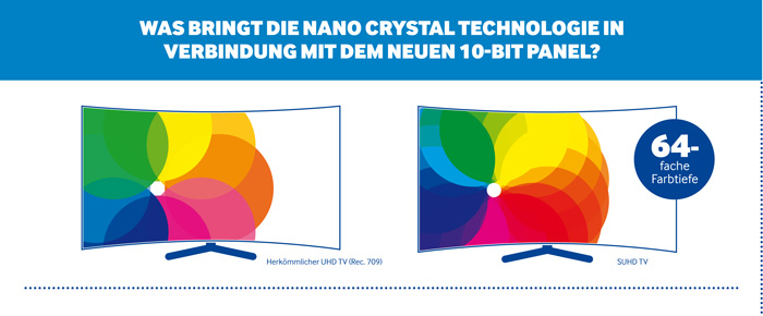 Dank Nano Crystal Technologie kann ein erweiterter Farbraum dargestellt werden, der bis zu 1,2 mal größer ist als bei bisher verwendeten Display-Technologien von Samsung. Das 10-bit Display ermöglicht die Steigerung der Farbtiefe um das 64-fache. Das Ergebnis ist eine größere und präzisere Farbdarstellung als bei herkömmlichen Samsung TVs.