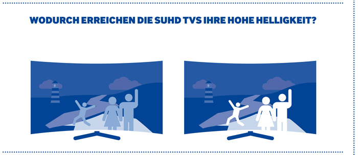 Auf welche Art und Weise aber erreichen die SUHD-TV-Geräte ihre hohen Helligkeitswerte? Hier setzt Samsung eine Eigenentwicklung, die Peak Illuminator Technologie ein. Diese erkennt im Vergleich zum restlichen Bild hellere Bildbestandteile und hebt diese hervor. So wird die Helligkeit des Bildes im Vergleich zu vorherigen Samsung Fernsehern um bis zu 37 Prozent gesteigert, ohne das dass Bild unscharf oder verwaschen wirkt. Die hohe Helligkeit sorgt dafür, dass das Fernsehbild auch bei hellem Tageslicht sehr deutlich und klar zu erkennen ist.