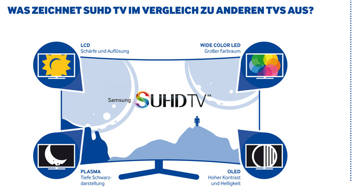 Mit SUHD TV stellt Samsung eine TV-Kategorie bereit, die ein Seherlebnis ermöglicht, das in dieser Qualität bisher im Bereich von LC-Displays (Flüssigkristall) kaum möglich erschien. Die neuen SUHD Modelle wie der JS9590, JS9090 und JS8590 bieten deutlich mehr Farbnuancen, sind je nach Gerät mehr als doppelt so hell und bis zu zweimal kontrastreicher als herkömmliche Samsung Fernseher.