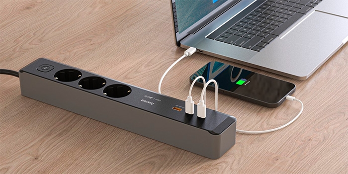 Wenn viele verschiedene Geräte gleichzeitig Strom benötigen, aber Steckdosen Mangelware sind, bietet sich die 3-fach Steckdosenleiste von Hama an. Der integrierte 100-W-USB-Lader mit einer USB-A- und zwei USB-C-Buchsen macht weitere Steckernetzteile für Smartphone und Co überflüssig – einfach...