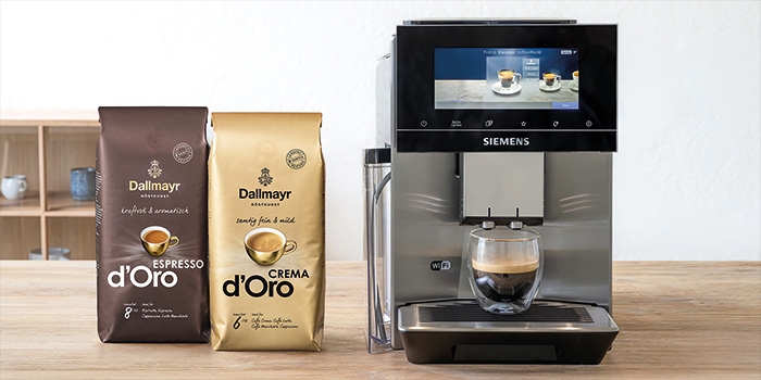 Kaffeetrinkende können von der neuen Partnerschaft direkt profitieren, denn mit Crema und Espresso d’Oro kommen zwei der beliebtesten Kaffeespezialitäten von Dallmayr jetzt ganz nach persönlichem Geschmack bequem per Knopfdruck in die Kaffeetasse. Mit dem innovativen beanIdent System des Siemens Kaffeevollautomaten EQ900 sind die idealen Einstellungen für die gewählten Kaffeebohnen Crema und Espresso d’Oro sogar schon automatisch voreingestellt. Ob als Crema, samtig fein und mild oder als Espresso, kraftvoll und aromatisch – so geht perfekter Kaffeegenuss auf Knopfdruck.